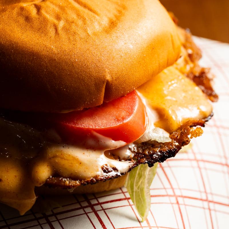 American cheese, Swiss cheese, boar's head bacon, tomato, Smash'd sauce.