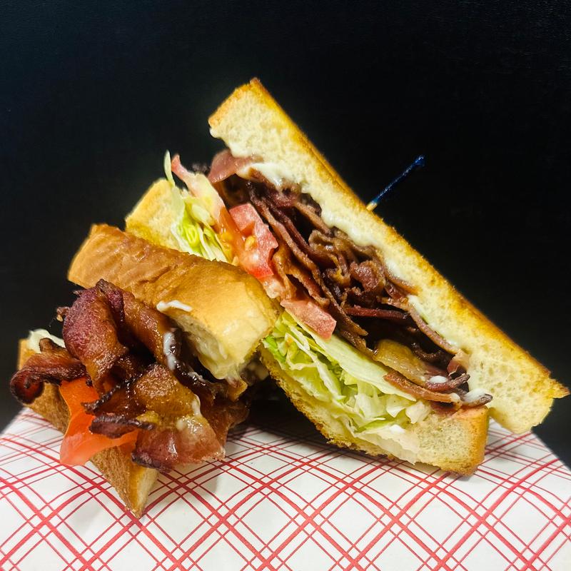 A classic BLT sandwich with Indiana Kitchen bacon, lettuce, tomato, mayo.